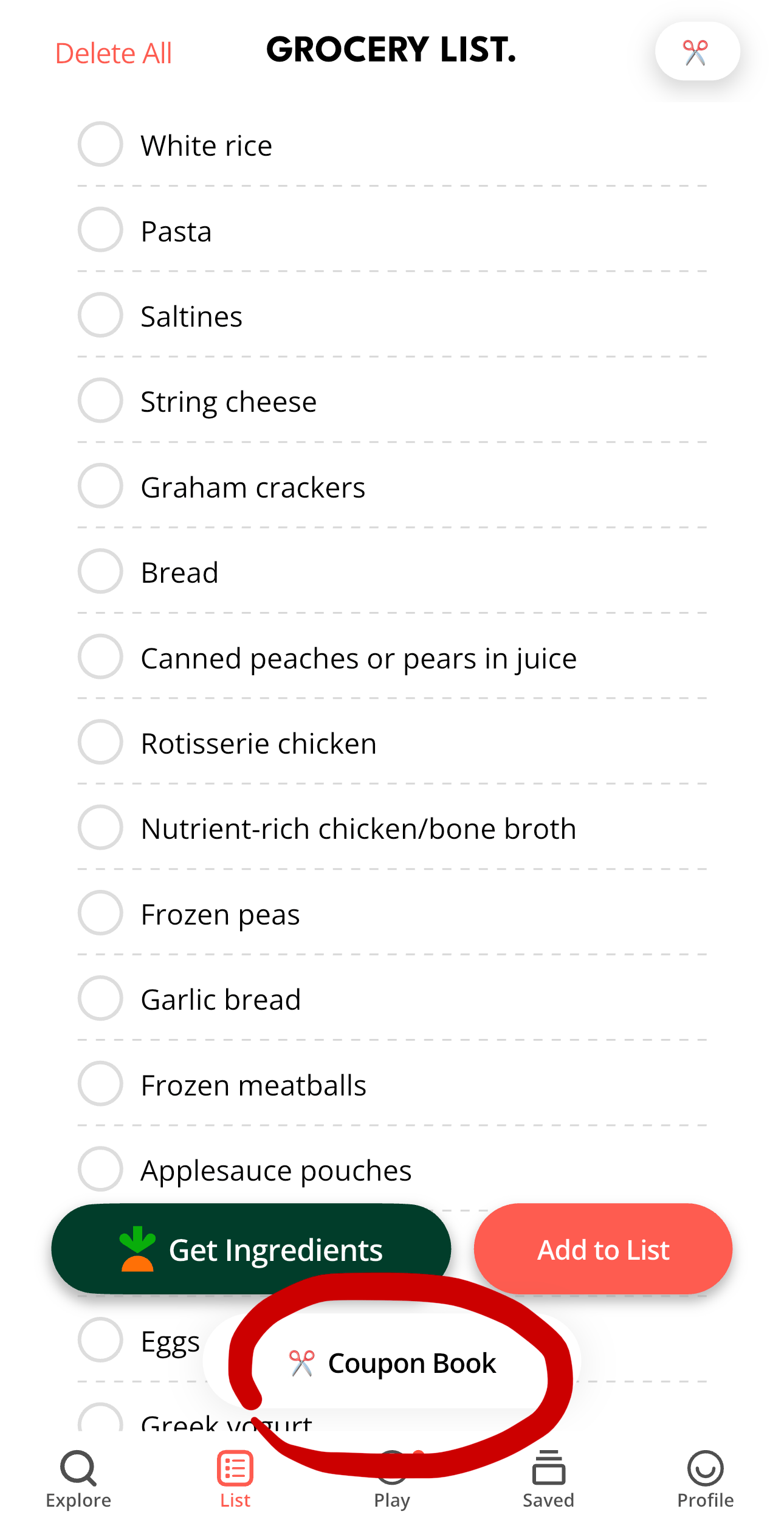 Just click “List” at the bottom to see where your Grocery List lives, and then go to the “Coupons” tab to shop your faves!